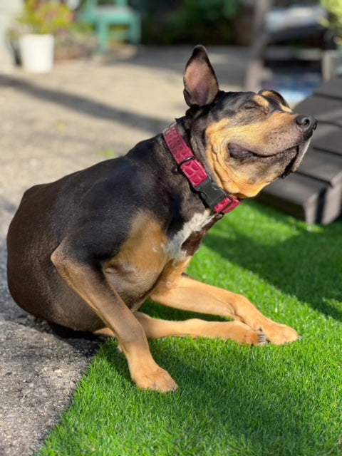 One of the RightOn! pet collar styles that utilizes the same material as one of Get'm Get'm guitar straps top sellers. These collars are luxe, and reduce waste! They feature beautifully embossed gator texture vinyl, in a range of colors. Soft to the touch, but still durable. They feature a signature bright red wallaby leather lining, to signify the love we have for our animal companions. Available in three sizes.