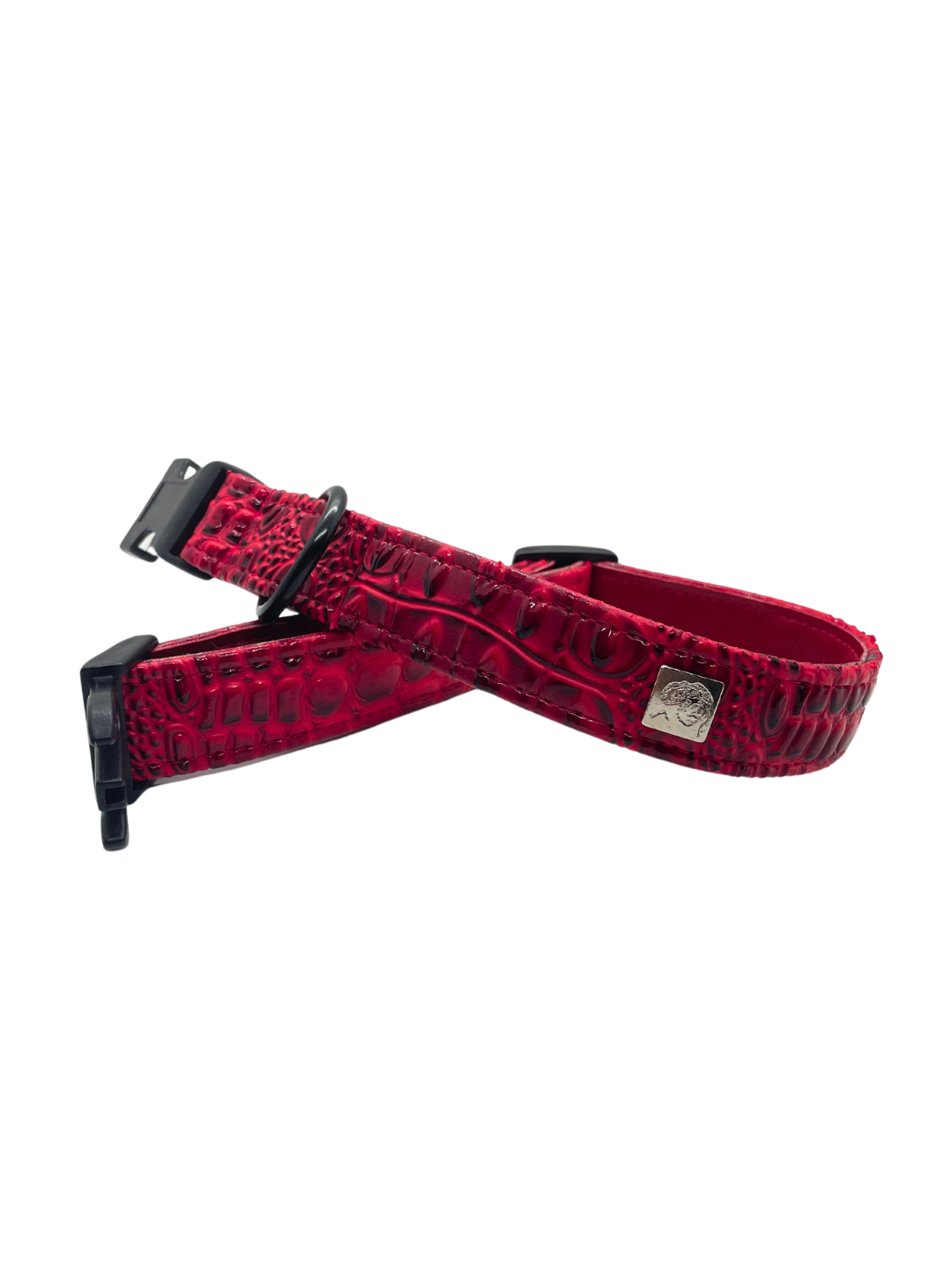 If you love a collar that feels luxe but still practical, this style delivers. It uses the same embossed gator-texture vinyl featured in one of Get’m Get’m’s top-selling guitar straps, which helps us reduce waste while giving pets a look that really stands out. The material is soft to the touch, comfortable for everyday wear, and available in a range of vibrant colors.