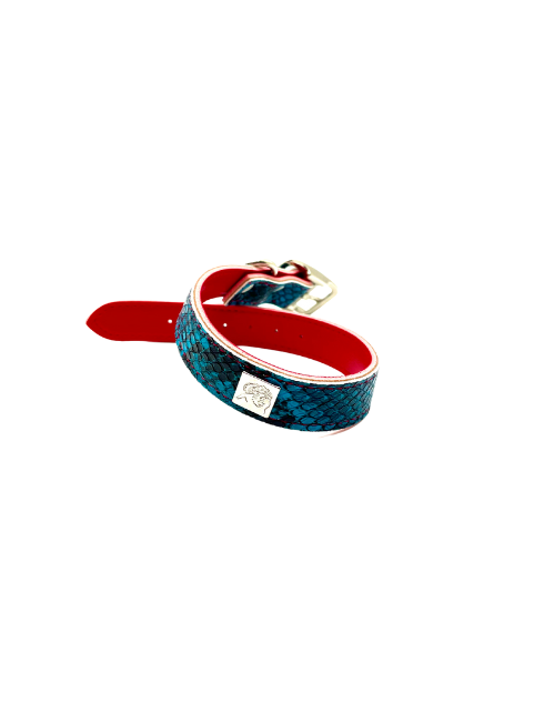 All RightOn! Accessories collars use the highest quality materials, made with a multi-layer construction, and interlined with webbing for strength and security, all stitched with matching heavy-weight nylon thread. The Turquoise Python collars are made with welded metal hardware in a shiny nickel finish. Handmade in downtown Los Angeles.
